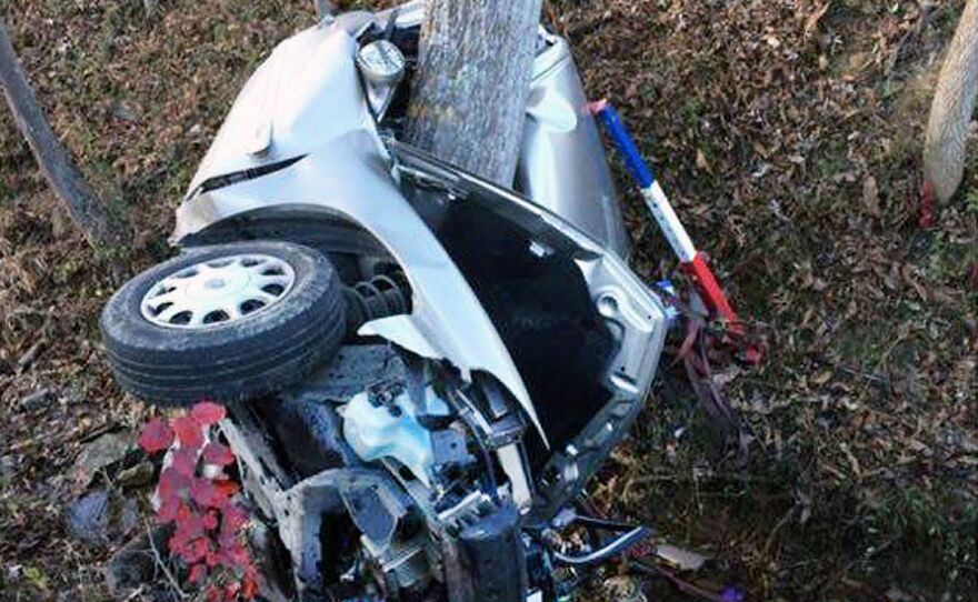 "I fell asleep, I guess," she said. "I woke up to my car veering (toward) the ditch line on the right side of the road. I freaked out and I over-corrected, and went across the lane of traffic, over the bank, over a hill and into a tree."