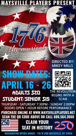 Maysville Players proudly presents “1776” the musical. Directed by Mikey Mills. Tickets can be purchased online at www.maysvilleplayers.net