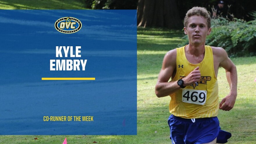Junior Kyle Embry (Hartford, Ky./Ohio County HS) parlayed his second-place finish and 15:44.00 time at Friday's eastern Kentucky Tri-Meet into an Ohio Valley Conference accolade as he was named the league's Men's Cross Country Co-Runner of the Week on Tuesday.